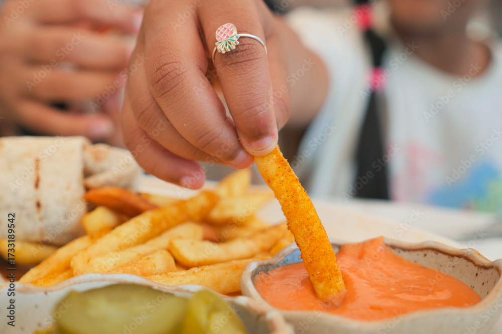 Kid enjoys dipping a crispy fry in a tasty sauce