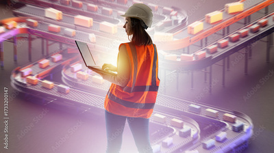 Woman in hard hat and safety vest using laptop to monitor automated conveyor system with parcels, logistics and warehouse management, Supply Chain Industry.