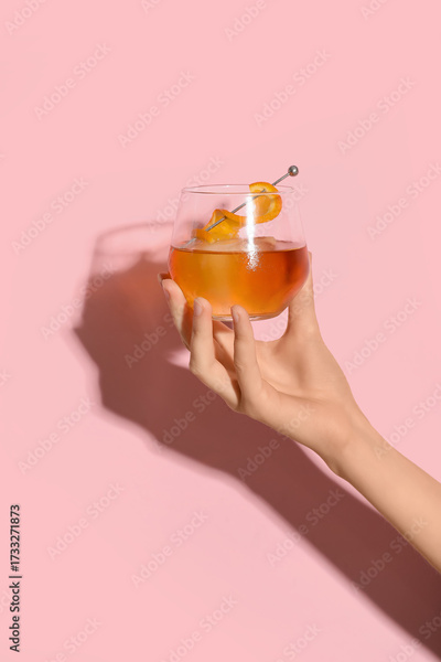 Female hand with glass of tasty Old Fashioned cocktail on pink background