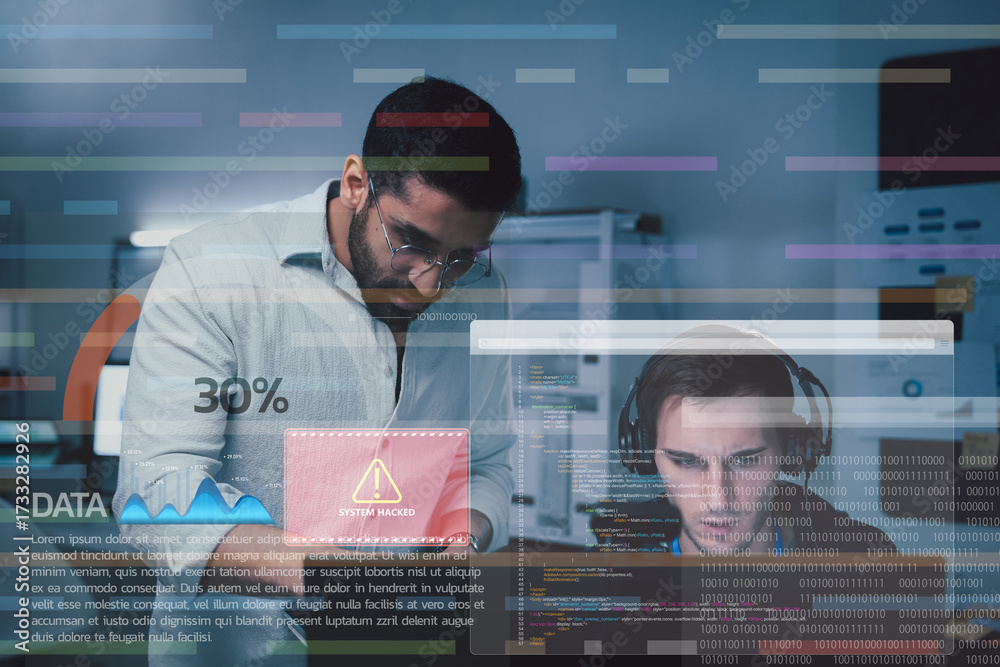 Cybersecurity experts analyzing system breach in high-tech office environment. Concept of data protection, system hacking, and cyber attack prevention strategy.