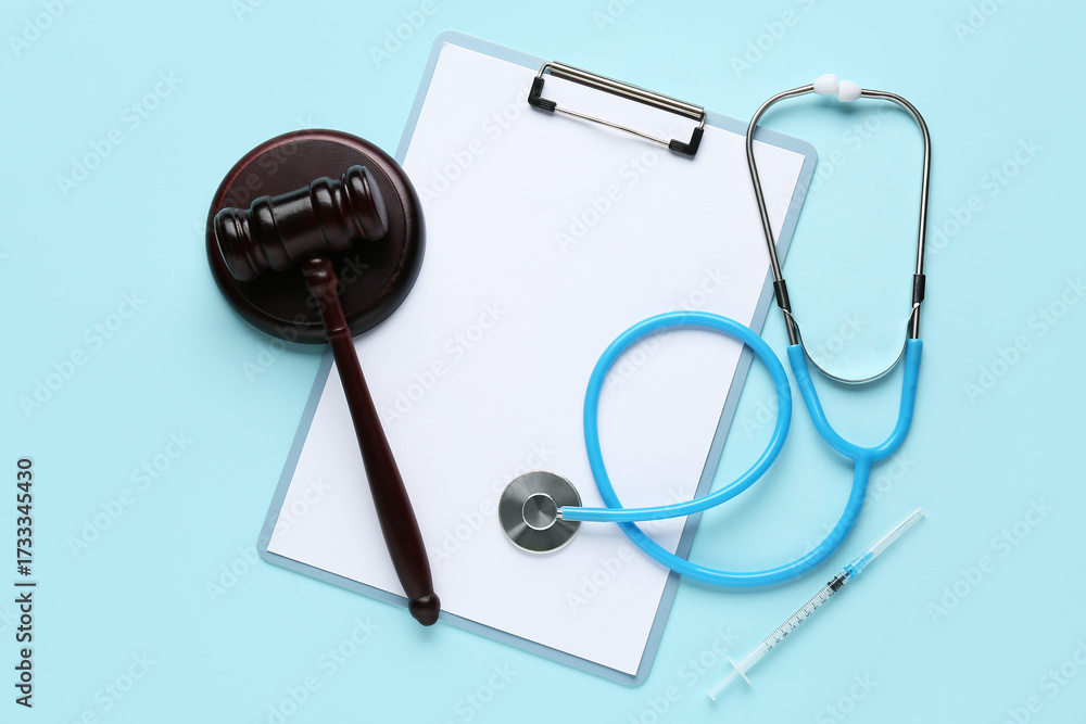 Judge gavel, clipboard, syringe and stethoscope on blue background. Concept of health care reform