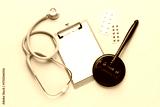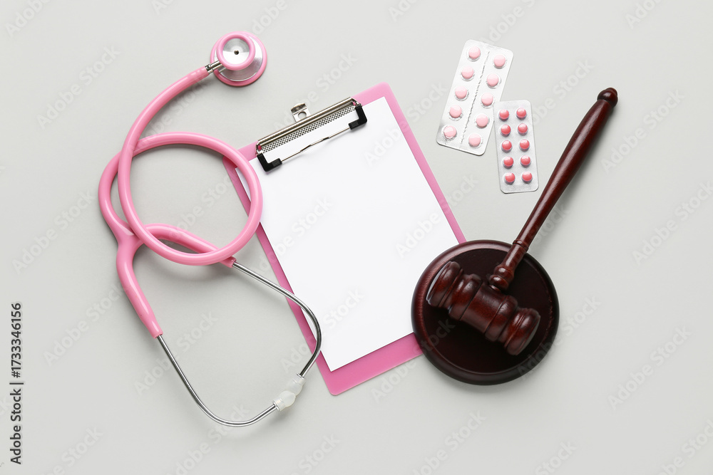 Judge gavel, clipboard, pills and stethoscope on grey background. Concept of health care reform