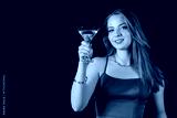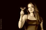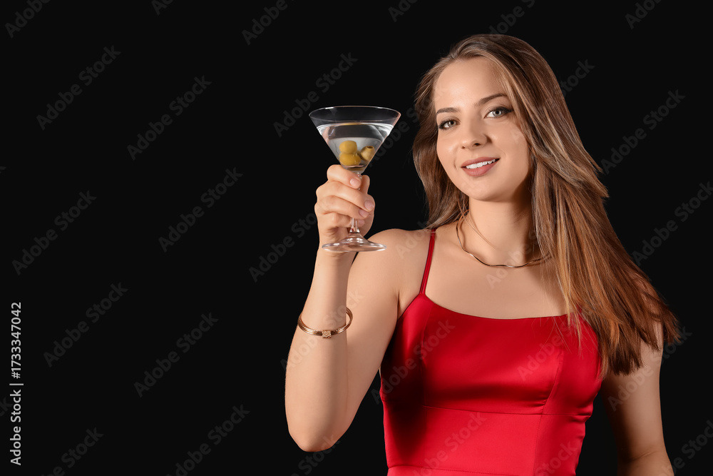 Beautiful woman with martini on black background