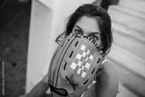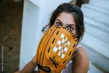 Woman hiding face with baseball glove on bleachers