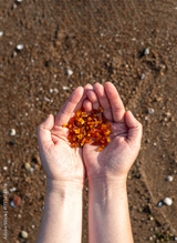 Amber stones on sea coast. Amber gems search on Baltic sea shore, fossilized tree resin crystals on sand