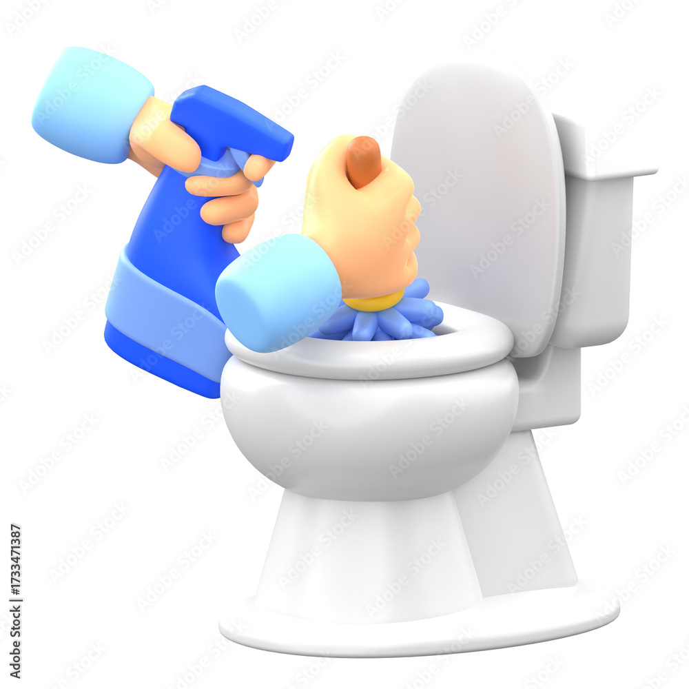 Cleaning White Toilet Bowl with Blue Spray and Brush on Transparent Background