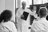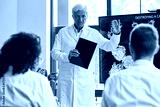 Senior Caucasian man explaining scientific research to diverse group of young colleagues in conference meeting, holding folder and gesturing toward digital display with medical images