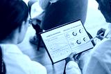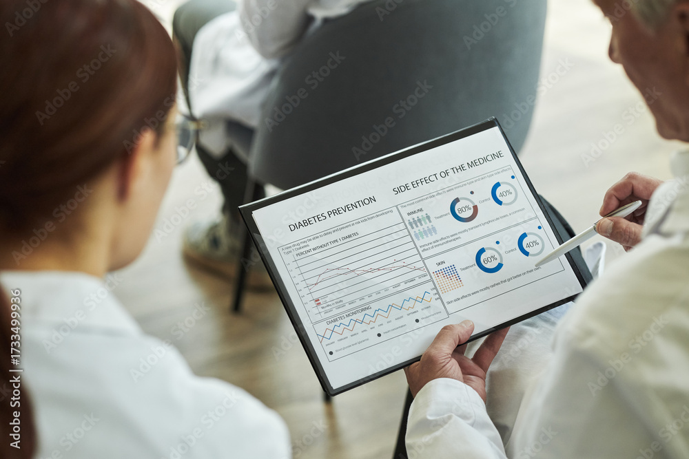 Caucasian middle aged male doctor showing diabetes prevention and medicine side effect charts to young female colleague during medical discussion, both wearing lab coats, seated indoors