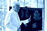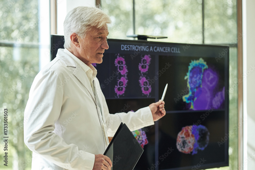 Senior Caucasian man presenting scientific research, holding digital tablet and pointing at screen displaying cancer cell images, standing in conference room at clinic