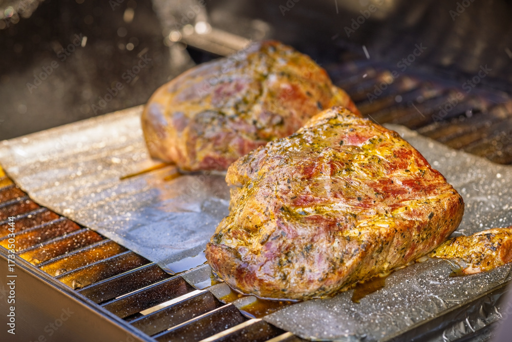 Barbecue smoker grill with grilled meat wrapped with bacon