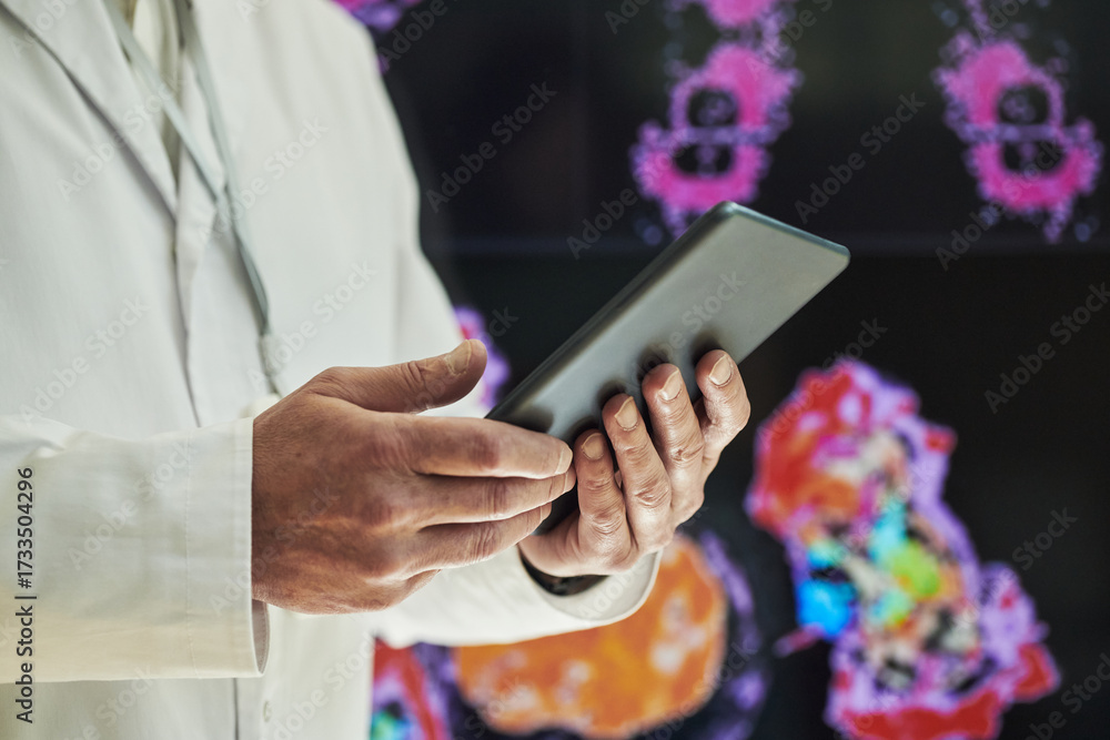 Middle aged Caucasian man in white lab coat holding digital tablet, standing in front of medical imaging display with colorful anatomical scans, using technology for healthcare analysis at conference