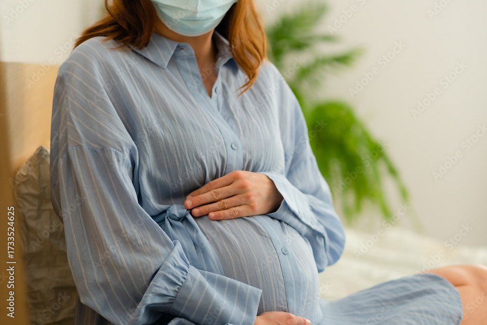 Future mother wearing protective mask while resting in bed. Managing illness symptoms responsibly during pregnancy.