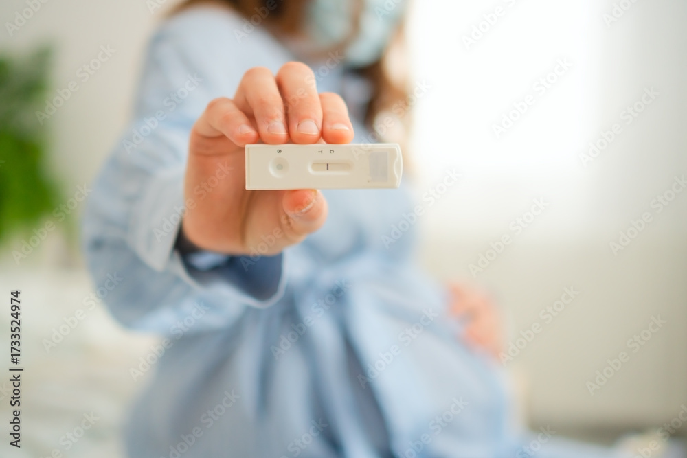 Expecting mother anxiously viewing PCR test results at home. Advanced diagnostics for infectious diseases during sensitive pregnancy period.