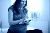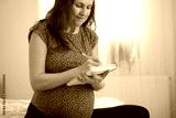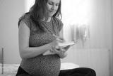 Pregnant woman holding pen and notebook, preparing a birth plan while sitting on bed.