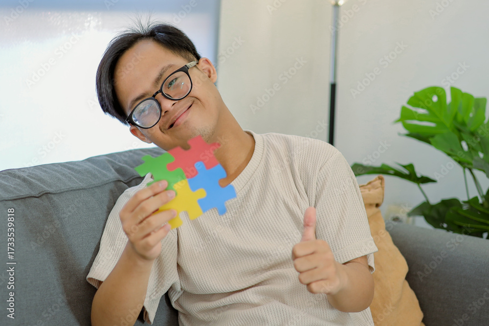Asian Teenage Kid Hold Colorful Puzzles Pieces and Showing Thumbs Up for World Autism Awareness Day