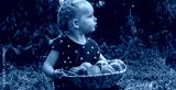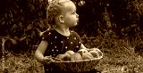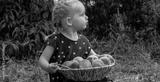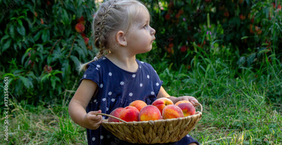 Child with Harvest. Little Girl Holding a Basket of Fresh Peaches.