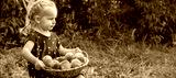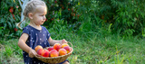 Child with Harvest. Little Girl Holding a Basket of Fresh Peaches.