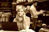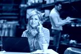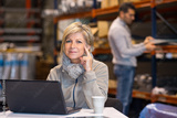warehouse manager posing next to laptop