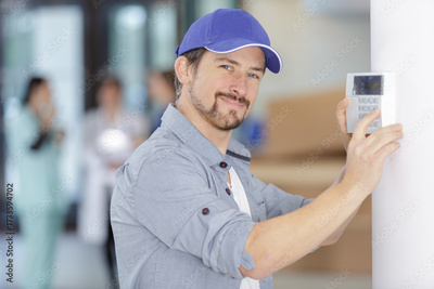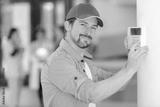 smiling man adjusting thermostat on home heating system