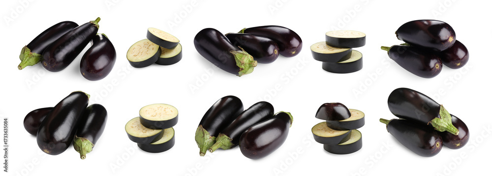 Fresh eggplants isolated on white, set. Whole and sliced