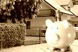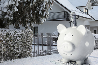 Save money to buy home. Piggy bank with dollars and house outdoors