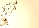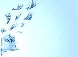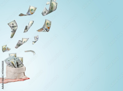 Woman holding sack with money on light blue background, closeup. Dollar bills flying