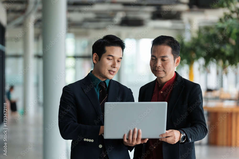 Asian businessmen discussing project using laptop, illustrating teamwork, mentorship, and corporate success in contemporary office setting