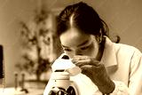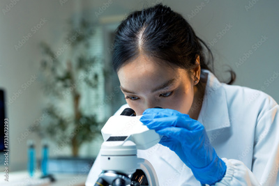 Female scientist researching samples, using a microscope and examining new data in a modern medical science laboratory