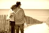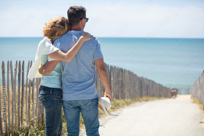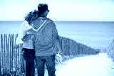 happy couple hugging on beach