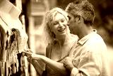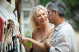 senior couple shopping for clothes on the market