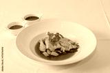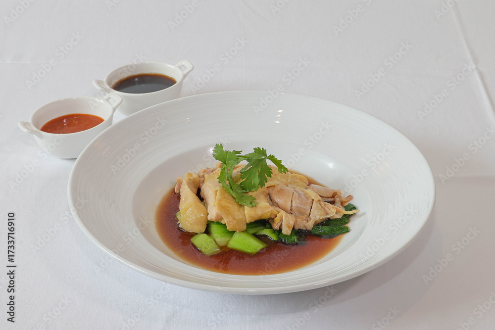 Hainanese Chicken Rice Platter: A delicious culinary presentation featuring tender chicken slices elegantly arranged alongside vibrant green vegetables and savory sauces.