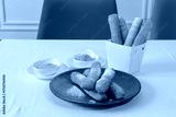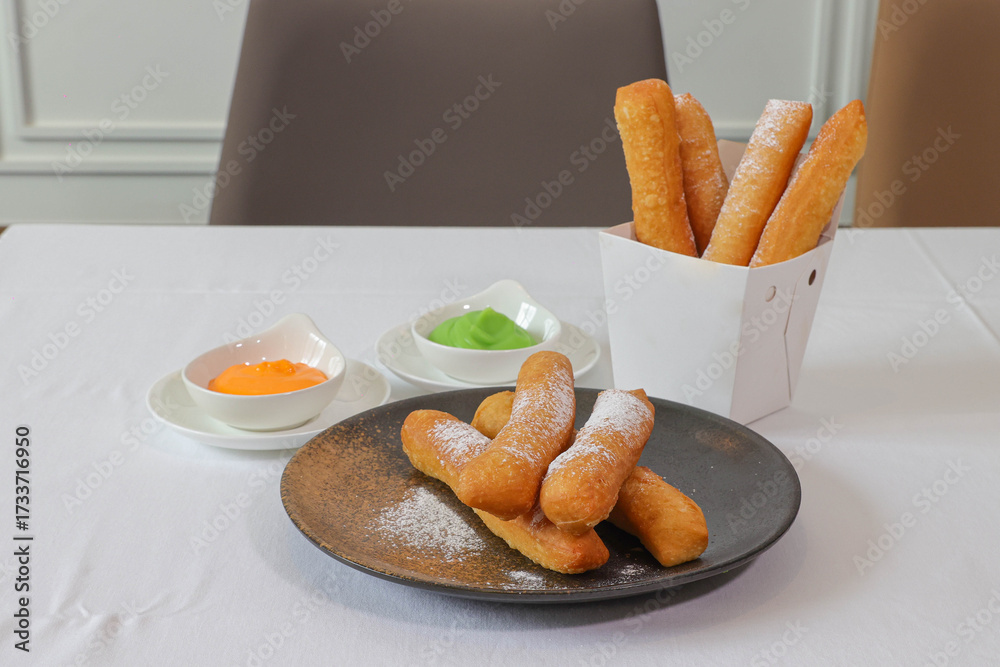 Golden Delights: A culinary arrangement showcasing several golden-brown, deep-fried fritters, artfully presented alongside a trio of vibrant dipping sauces on a clean tabletop.