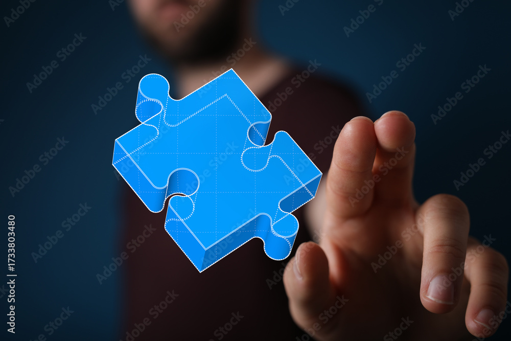 Close up of a hand connecting a 3d rendered blue puzzle piece. Concept of business success, problem solving, teamwork, or completing a task.