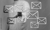 Person interacting with email symbols on a screen. Concept of communication and technology.