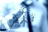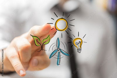 Hand interacting with eco-friendly energy icons: sun, plant, wind turbine, lightbulb. Concept of sustainable development.