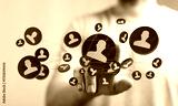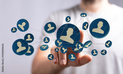 Person touching 3D rendering of profile icons, idea of connecting people on internet, building social network.