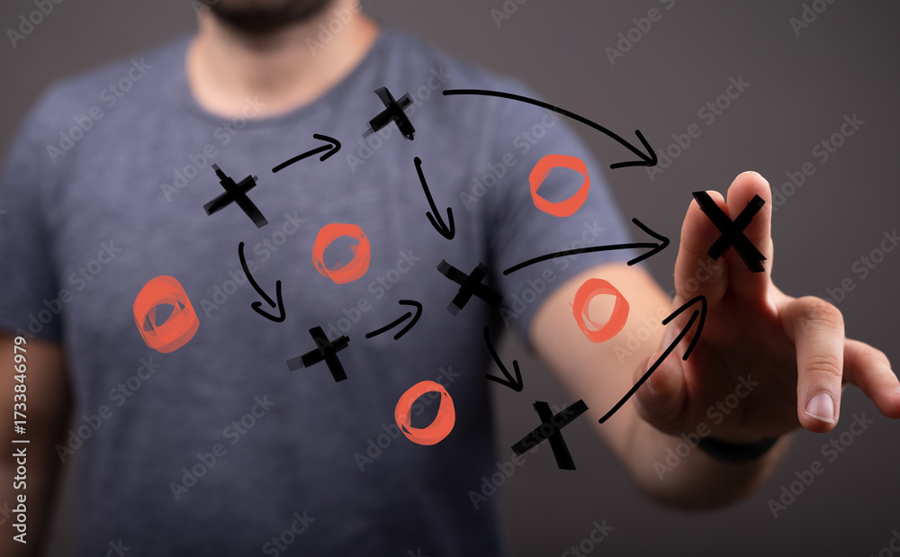 A man makes a strategic decision, choosing the best option from several possibilities. Concept of planning, success, and choice.