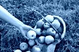Woman putting ripe apple into wicker basket on green grass outdoors, closeup