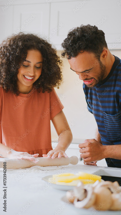 Couple At Home With Man With Down Syndrome And Woman Rolling Dough For Pizza In Kitchen Together