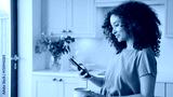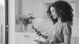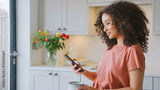 Young Woman In Kitchen At Home Checking Social Media On Mobile Phone With Hot Drink