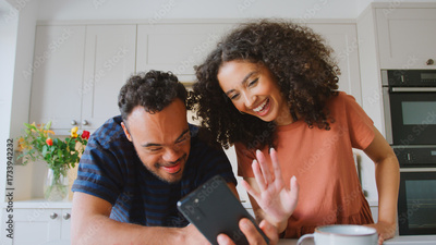 Couple At Home With Man With Down Syndrome And Woman Making Video Call On Mobile Phone