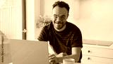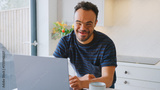 Man With Down Syndrome At Home Working On Laptop On Kitchen Surface