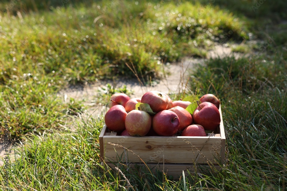 Fresh ripe apples in wooden crate on green grass outdoors. Space for text