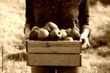 Woman holding wooden crate of ripe apples outdoors, closeup