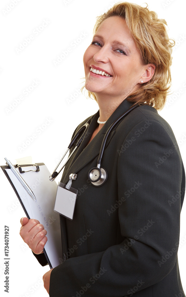 Lachende Ärztin im Anzug mit Klemmbrett