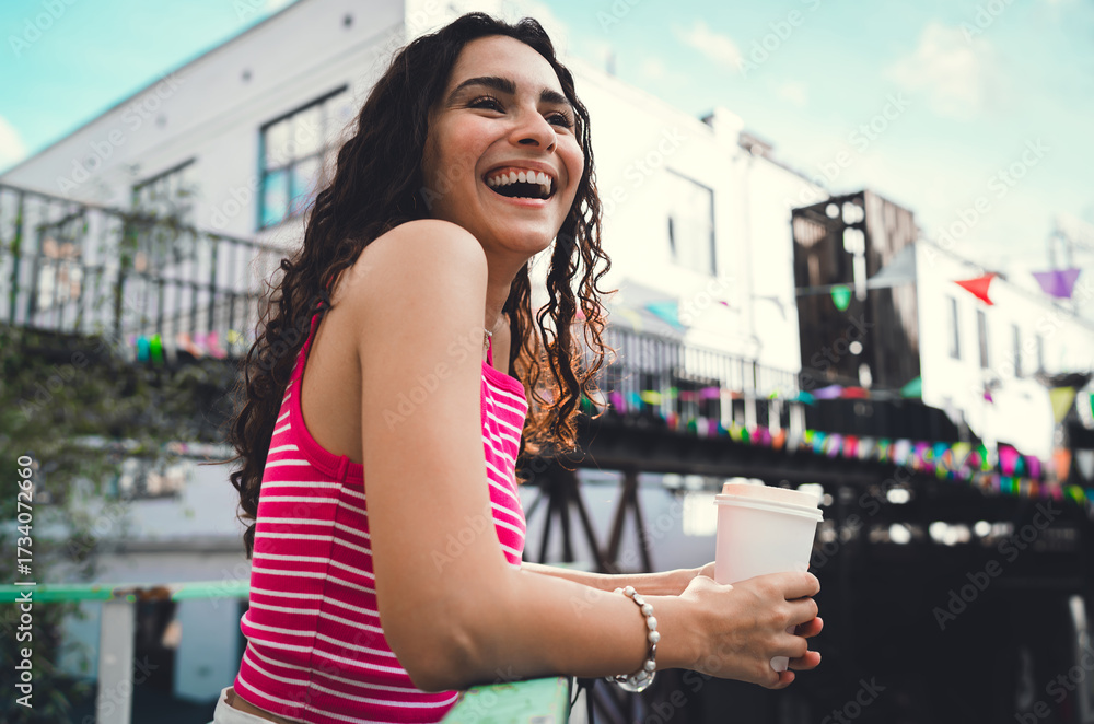 Woman laughs brightly while holding coffee, expressing joy, emotional ease and the freedom of spontaneous freelance life enhanced by small rituals and digital detachment.