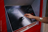 Close-up of female hand approaching ATM screen, highlighting intuitive touch-based interaction and everyday reliance on secure financial technology.