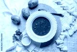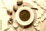 A bowl of rich tomato soup sits on a woven placemat, accompanied by golden bread and fresh herbs