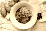 A bowl of noodles with tender chicken and cilantro on a textured fabric backdrop