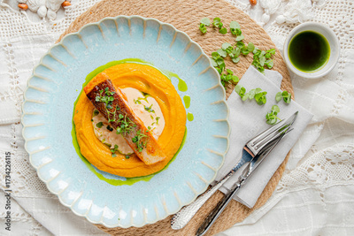 A beautifully plated salmon fillet rests on a vibrant squash puree, garnished with herbs